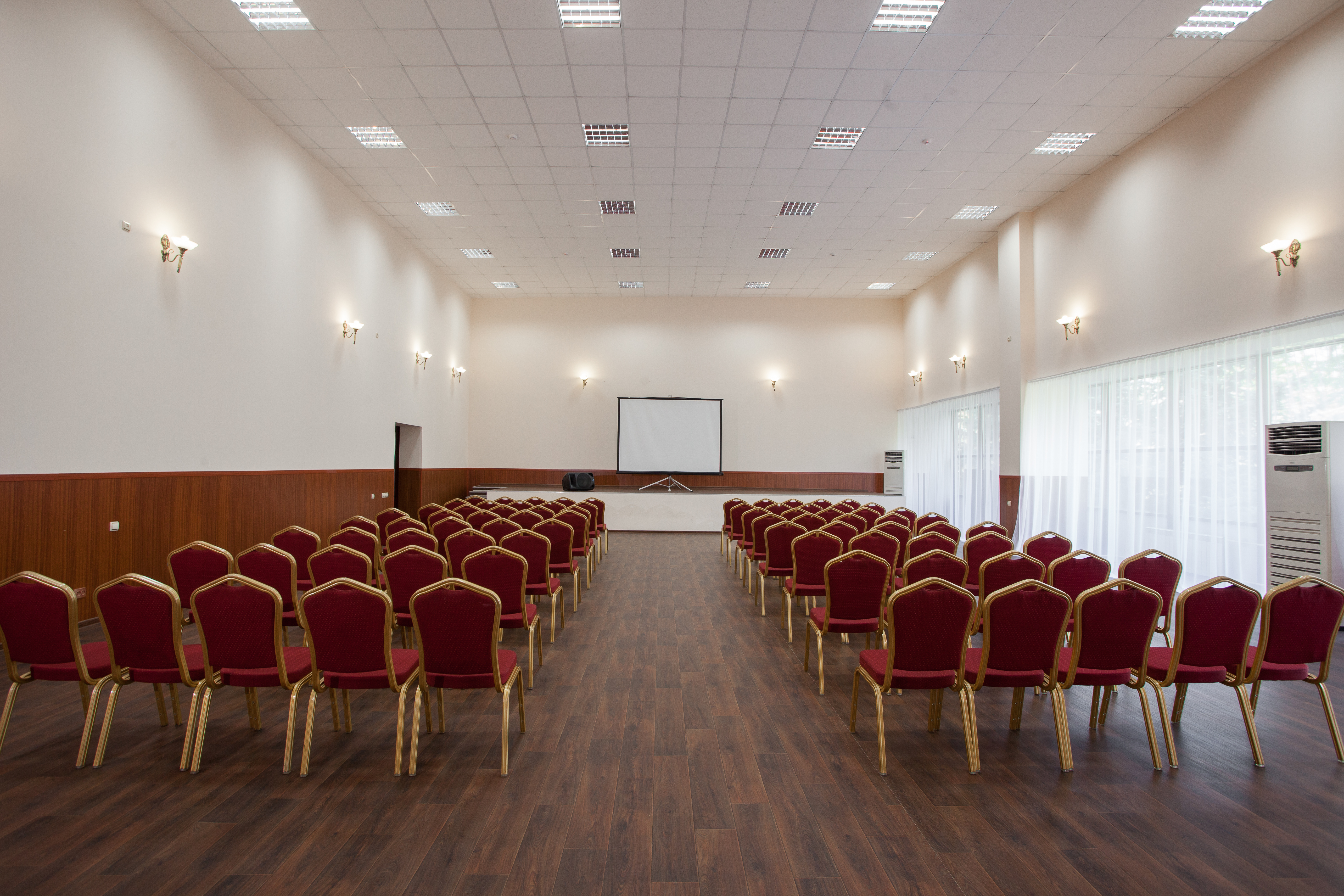 Зал отлично подходит для проведения больших мероприятий. Сцена для выступления, высокие потолки и панорамные окна.